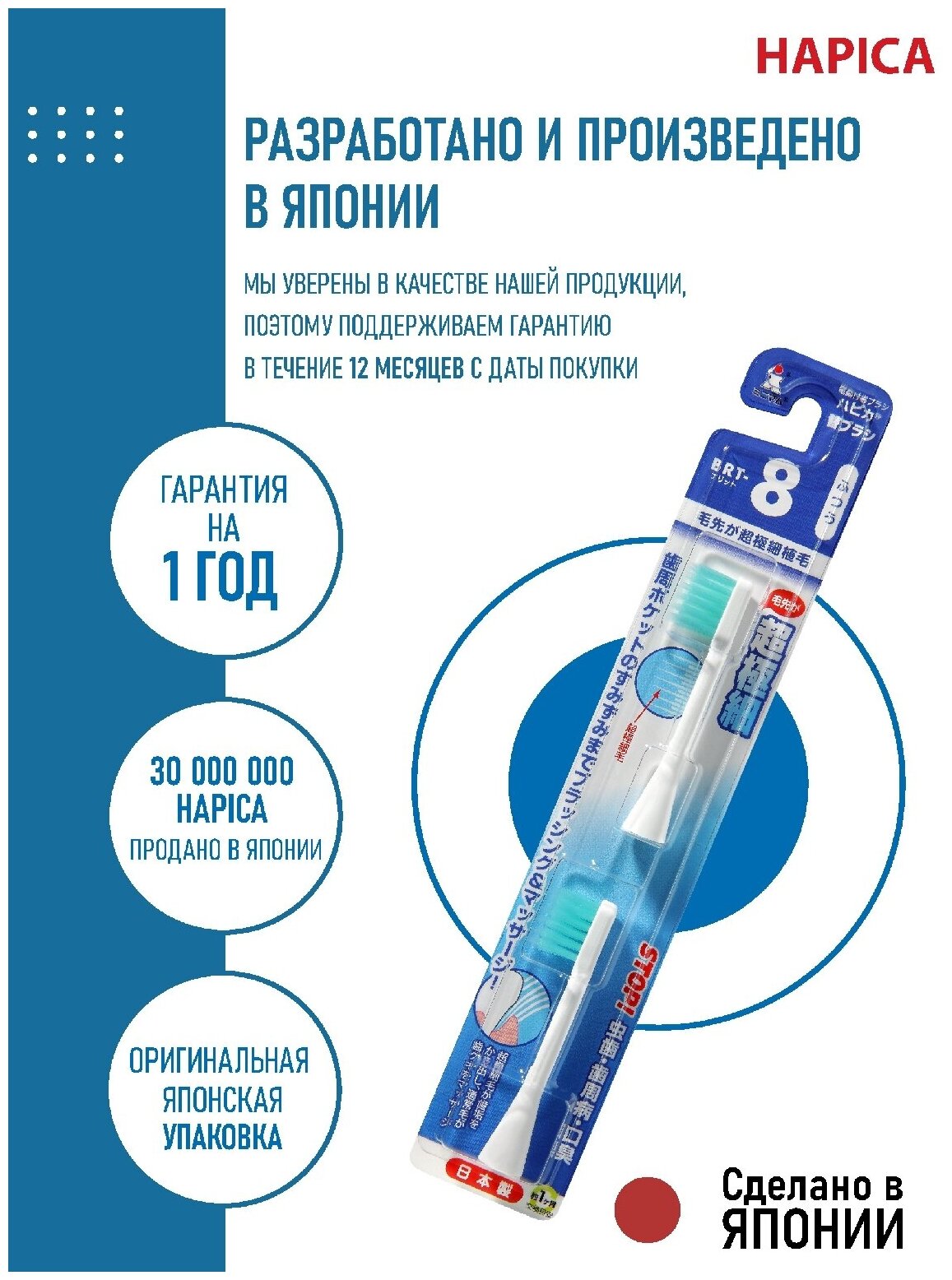 Cменные насадки для электрической зубной щетки Hapica BRT-8 для профилактики заболеваний парадонта, 2 шт. Средняя жесткость. Подходят всем щёткам Hapica