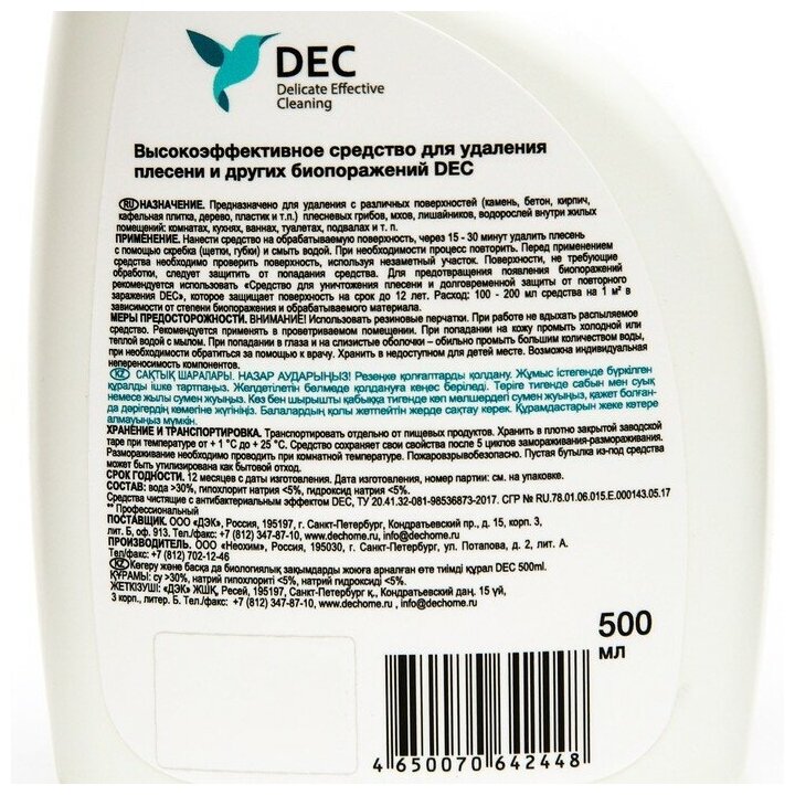 "DEC" Высокоэффективное средство для удаления плесени и других биопоражений (0,5 л)