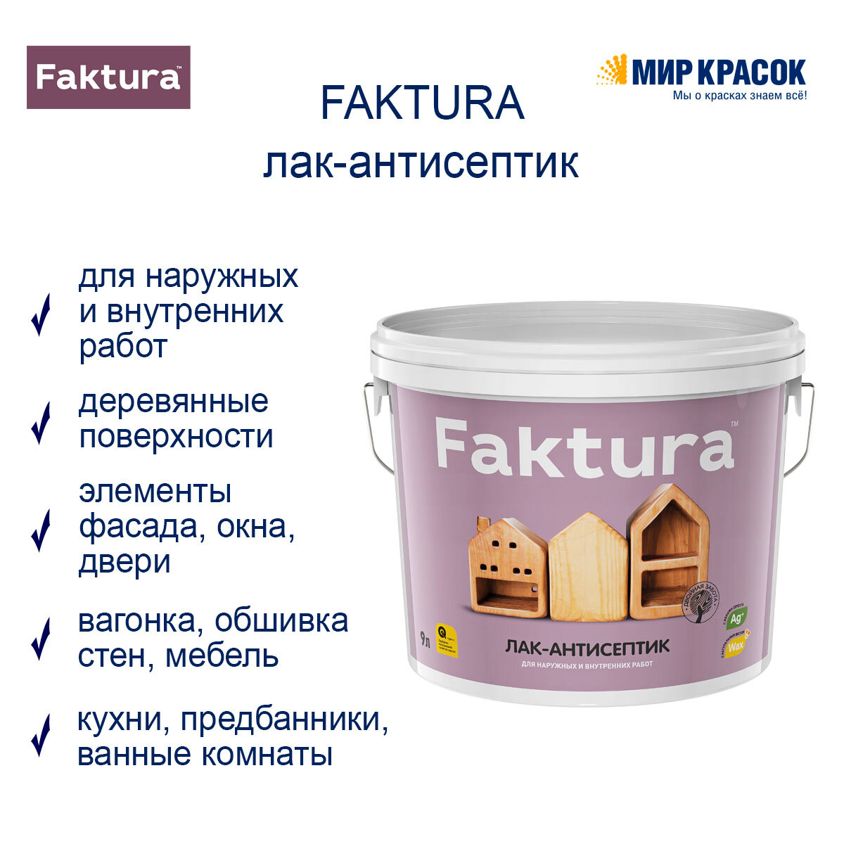 Лак-антисептик Faktura, шелковисто-матовый, полиакриловый, бесцветный, для внутренних и наружных работ, 0.9 л