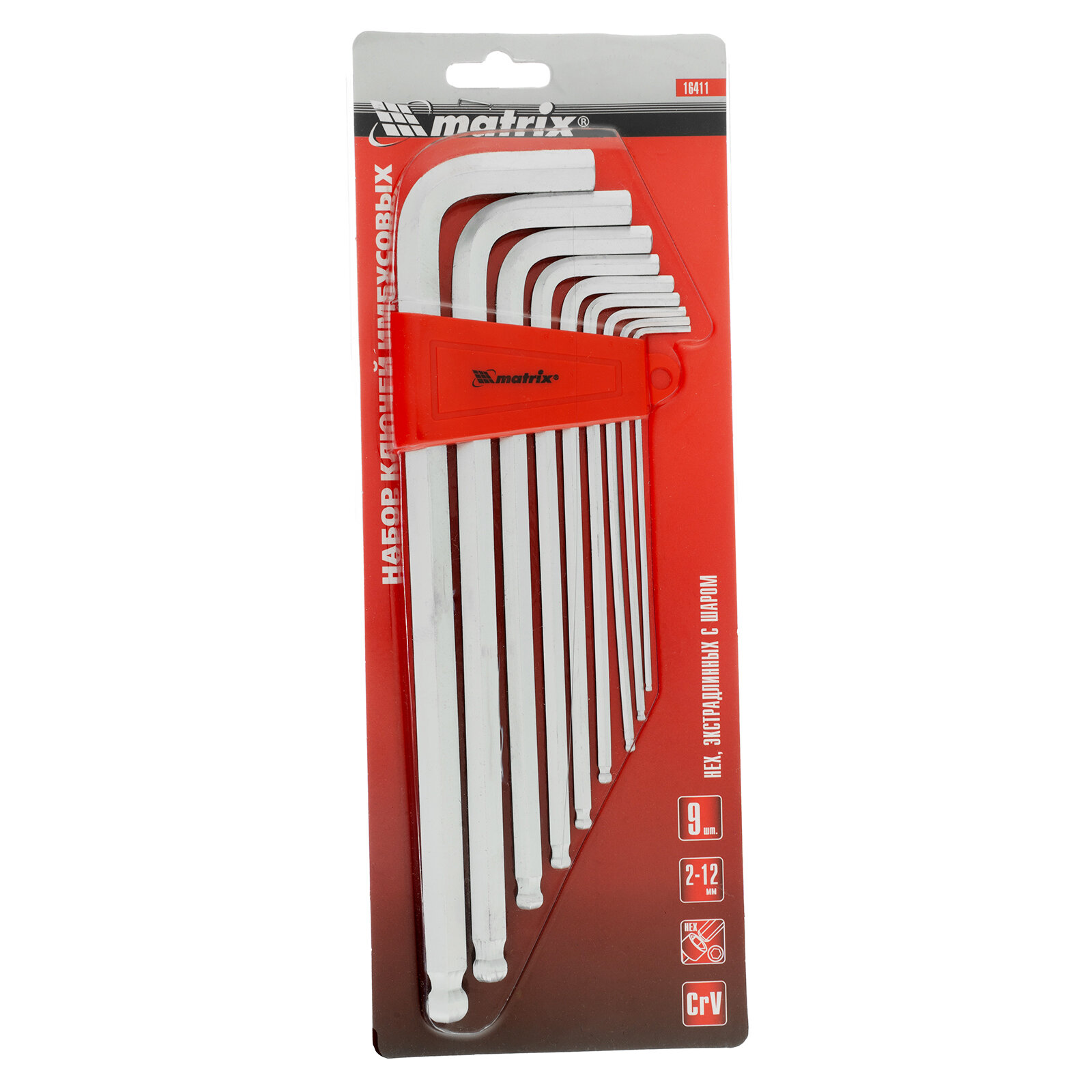 MATRIX Набор ключей имбусовых HEX, 2-12 мм, CrV, 9 шт, экстра-длинные, c шаром, сатин Matrix, ( 16411 )
