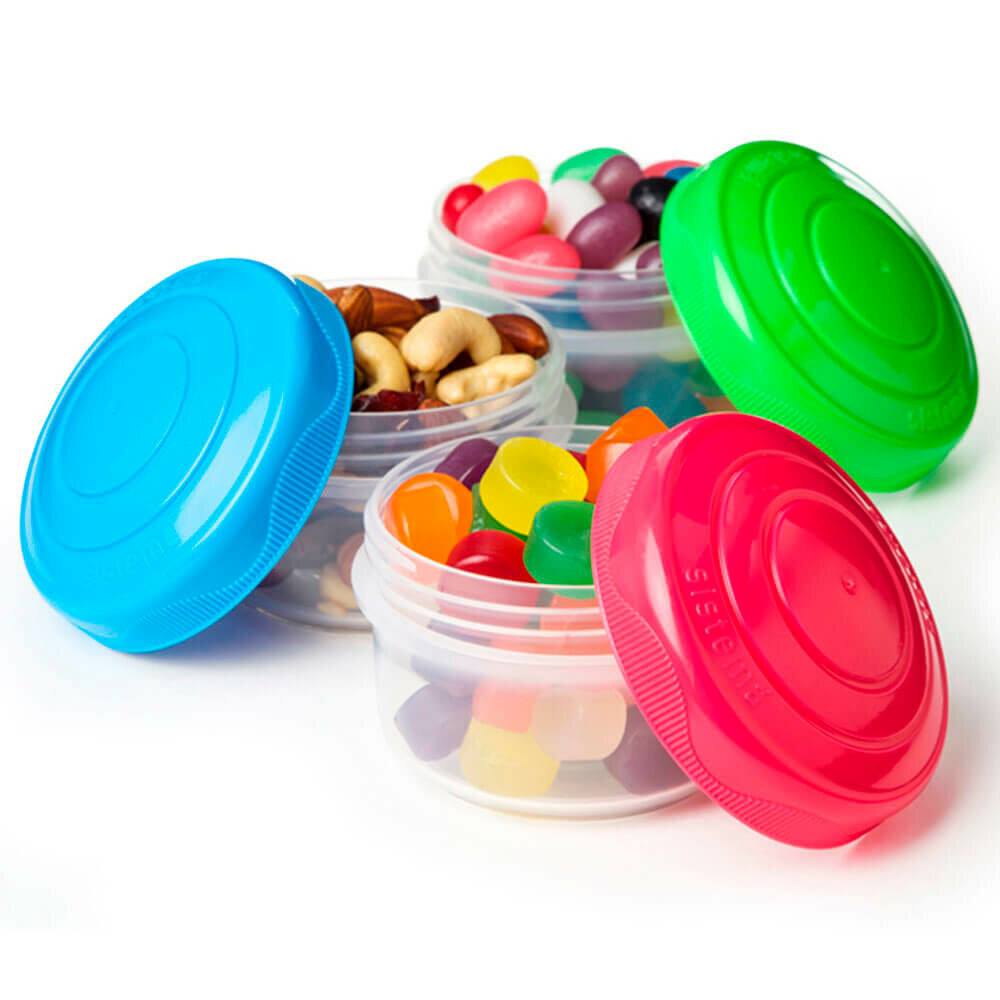 | Плюсы: | Яркие и симпатичные. Крышки хорошо закручиваются, можно ставить друг на друга |