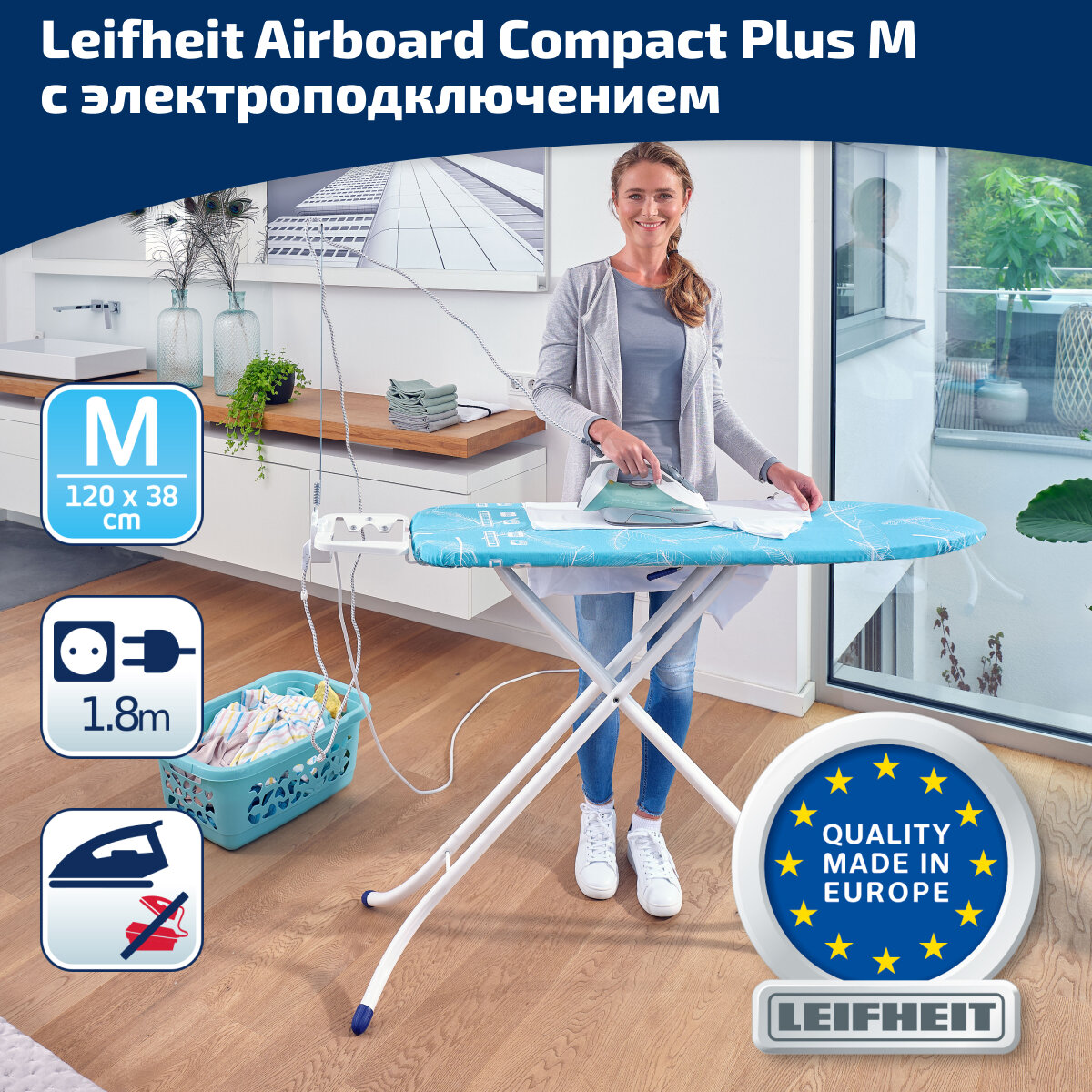 Гладильная доска Leifheit AirBoard Compact M Plus, 120х38см с электроподключением, синий 72586