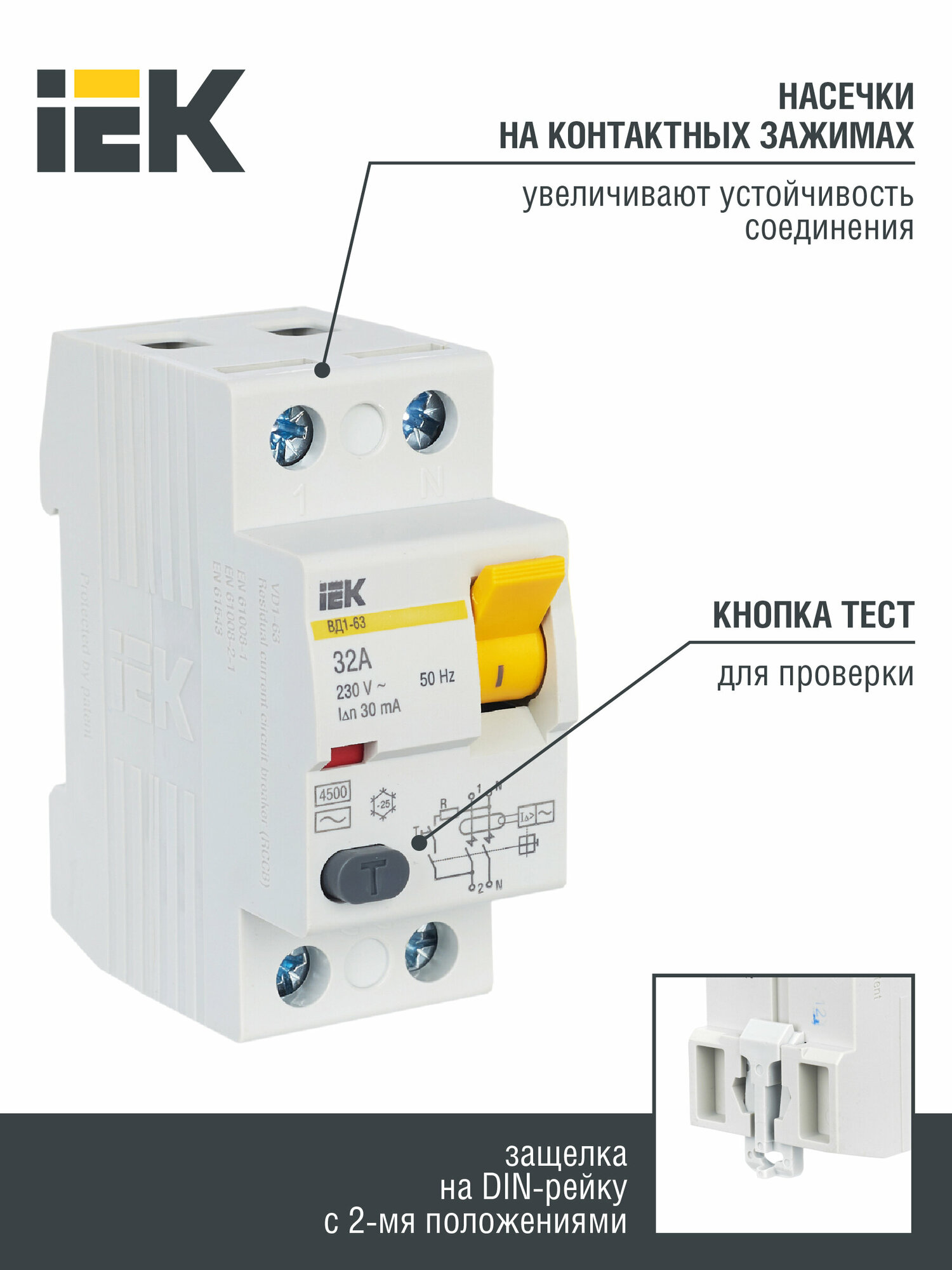 Выключатель дифф.тока УЗО IEK MDV10-2-032-030 ВД1-63 32A 30мА AC 2П 230В 2мод белый (упак.:1шт)