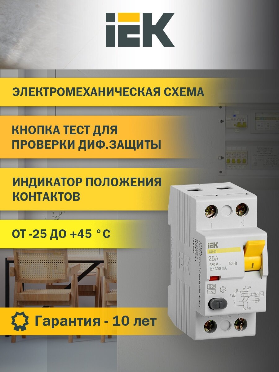 Выключатель дифференциального тока ВДТ (УЗО) 25А 2П двухполюсный 4,5кА 300мА AC ВД1-63 MDV10-2-025-300 IEK