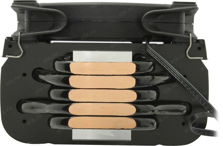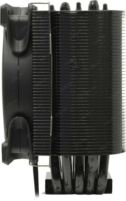 | Плюсы: | Высокий TDP, высокая эффективность. Тихий вентилятор. Достаточно плоское основание. 5 трубок толщиной 8мм. Боковые стенки закрыты. Прорезь в середине для обдува VRM.