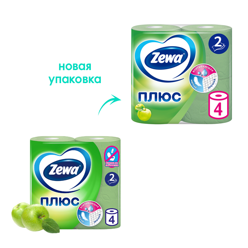 Туалетная бумага Zewa Плюс аромат «Яблоко», 2 слоя, 4 рулона