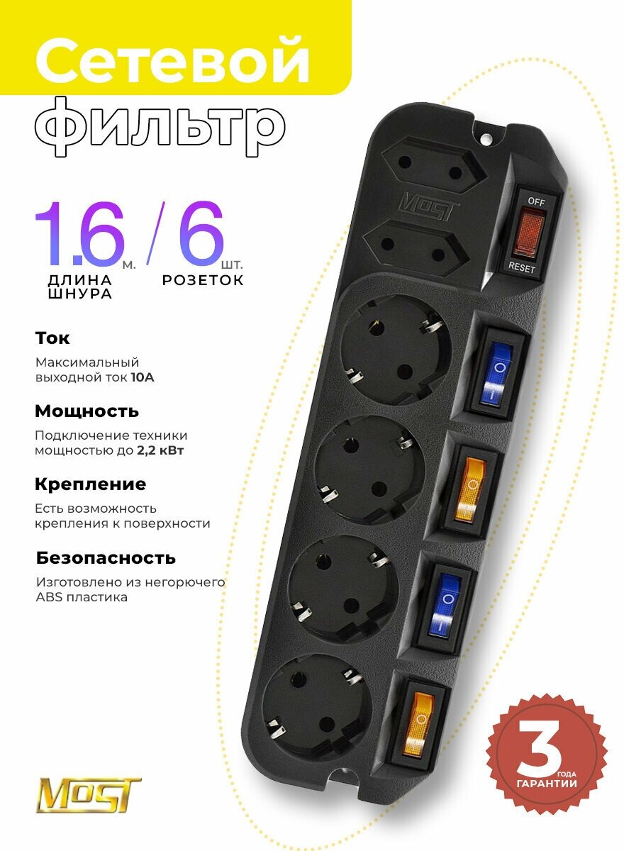Сетевой фильтр Most ARG 1.6м (6 розеток), черный