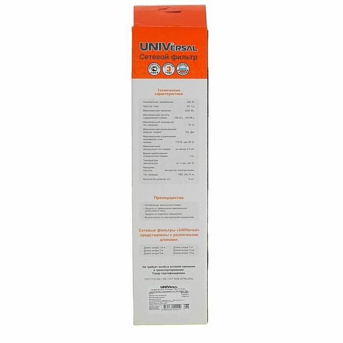 Фильтр UNIVersal сетевой серый 6 розеток 1,8м Универсал фильтр сетевого напряжения с защитой 220в, арт. 967U-5001