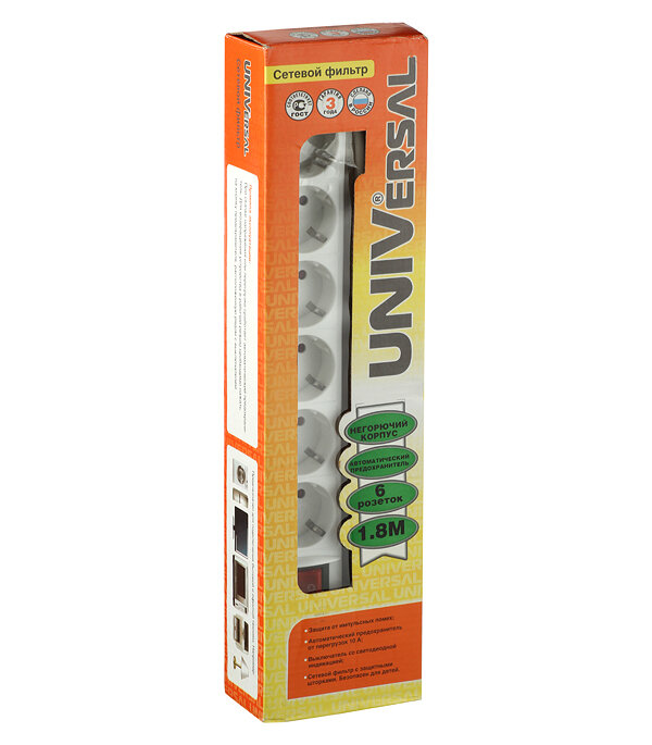 Сетевой фильтр UNIVersal 967U-3001, 6 розеток, с/з, 10А / 2200 Вт белый 1.8 м 345 мм 53 мм 40 мм