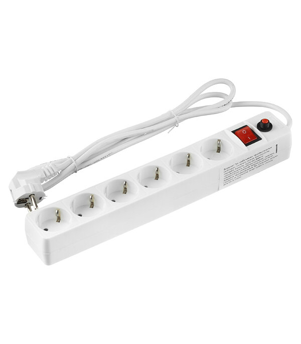 Удлинитель, сетевой фильтр (пилот) 6 мест, 1.8 м, UNIVersal, ПВС 3х0.75, белый, с предохранителем