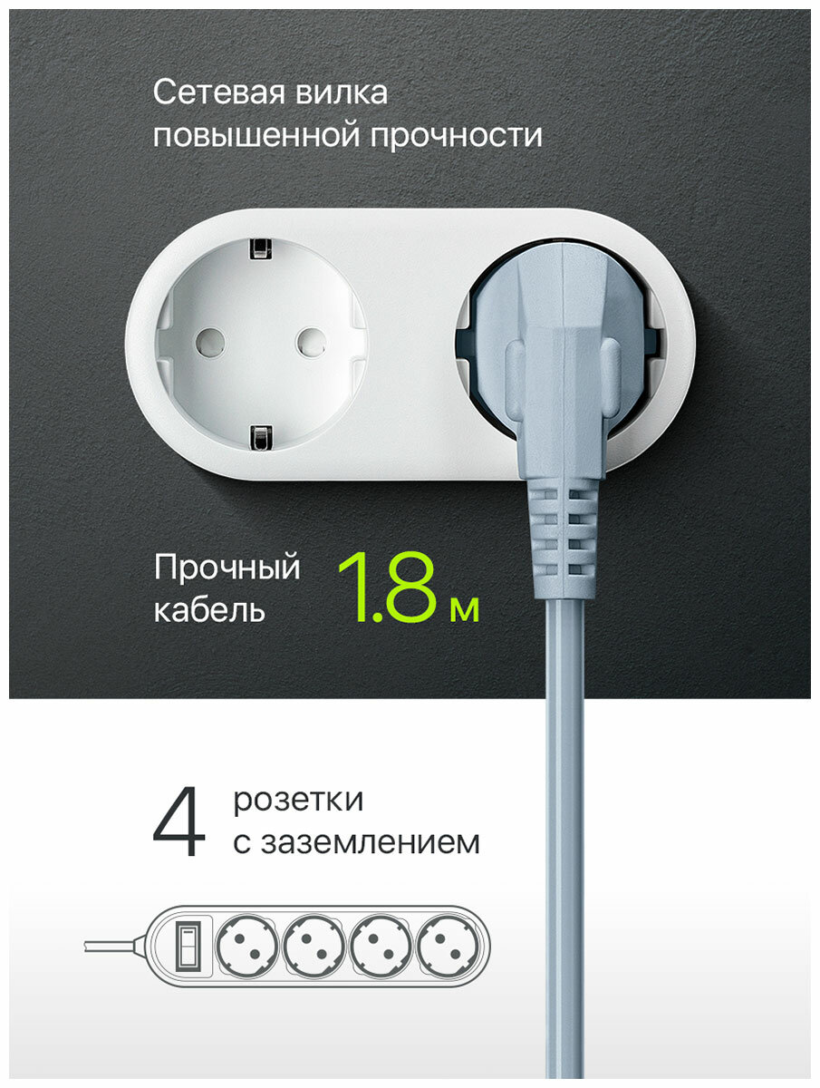 | Отзыв: | Защита от перегрузки и короткого замыкания - предохранитель срабатывает хорошо. Удобно, что можно подключить 4 разных устройства в 4 розетки. Цвет серый, немаркий. Качество пластмассы хорошее. Работает несколько месяцев исправно. Не перегревается. Евровилка входная, в 4 розетки хорошо подключаются как евровилки, так и обычные. |