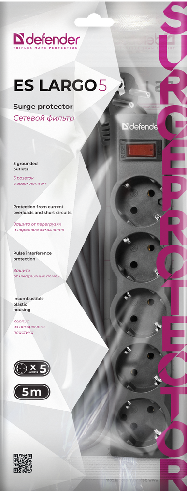Сетевой фильтр Defender ES largo, 5 розеток, с/з, 10А / 2200 Вт черный 1.8 м 270 мм 50 мм 40 мм