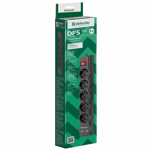 Сетевой фильтр DEFENDER DFS753, 5 розеток, ПВС 3*1,0 мм2, мощность 2200 Вт, ток 10А, черный, 3,0 м 2xUSB, 2.1A