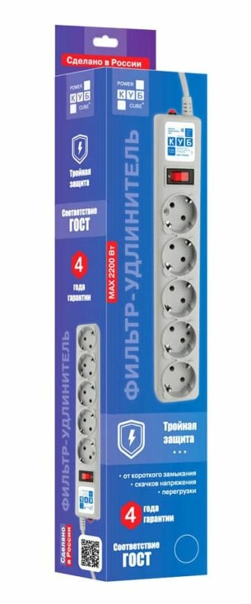 Power Cube 3 метра, 5 розеток с завземлением, 10А/2,2кВт, Сечение провода: 3*0.75 мм, цвет белый, 4 года гарантии, Россия