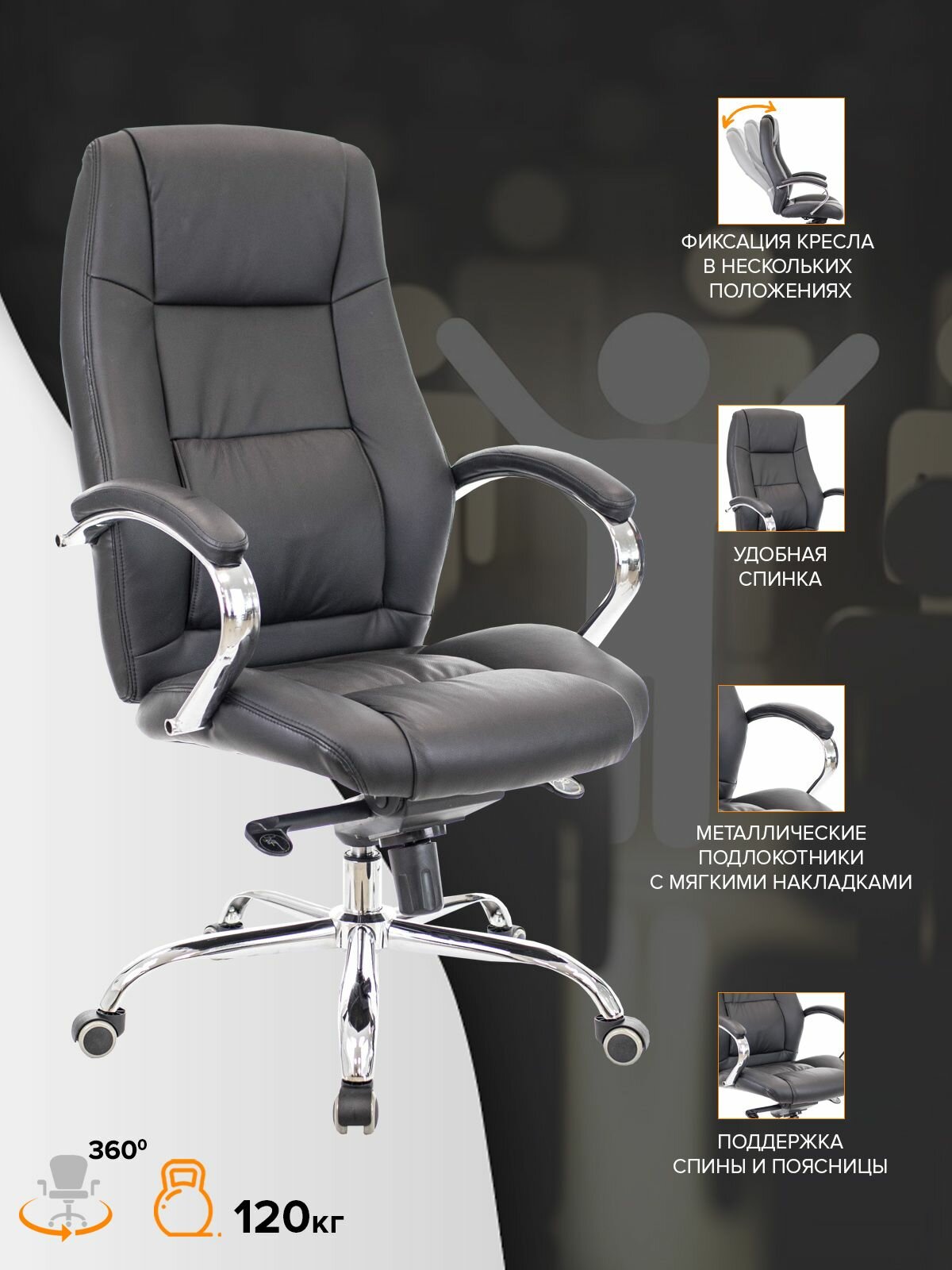 Кресло для руководителя Everprof Kron M кожа поясничная поддержка, колесики для паркета, макс. нагрузка 120 кг EC-366 Leather Black черный