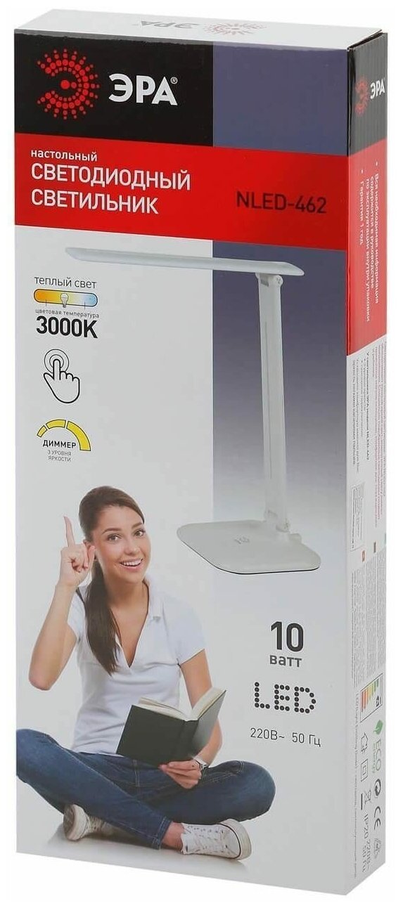 ЭРА Б0031612 Настольный светодиодный светильник NLED-462-10W-W белый {складной, 3 ступенчатый диммер яркости, цвет. темп. 3000К}