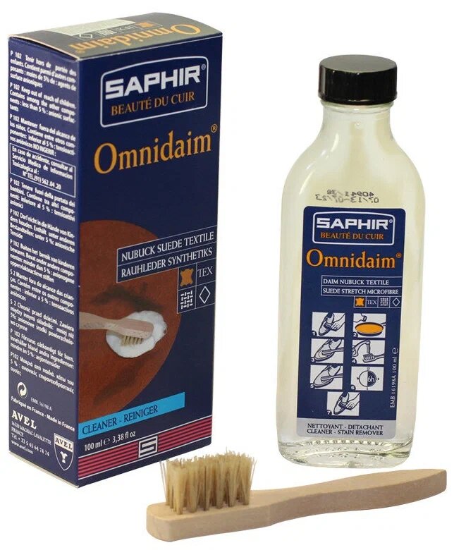 Купить Очиститель всех видов замши, материалов "стретч", текстиля Omnidaim SAPHIR, стеклянный флакон, 100 мл.