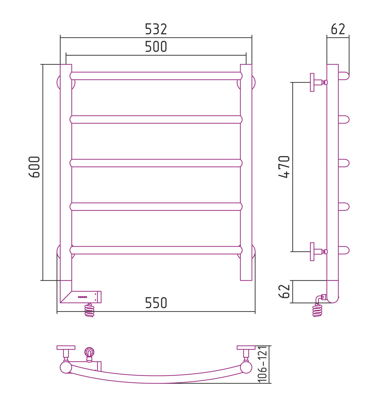 Полотенцесушитель электрический Сунержа, РЭБ “галант 2.0“ 600х500 / МЭМ левый (Матовый Чёрный)