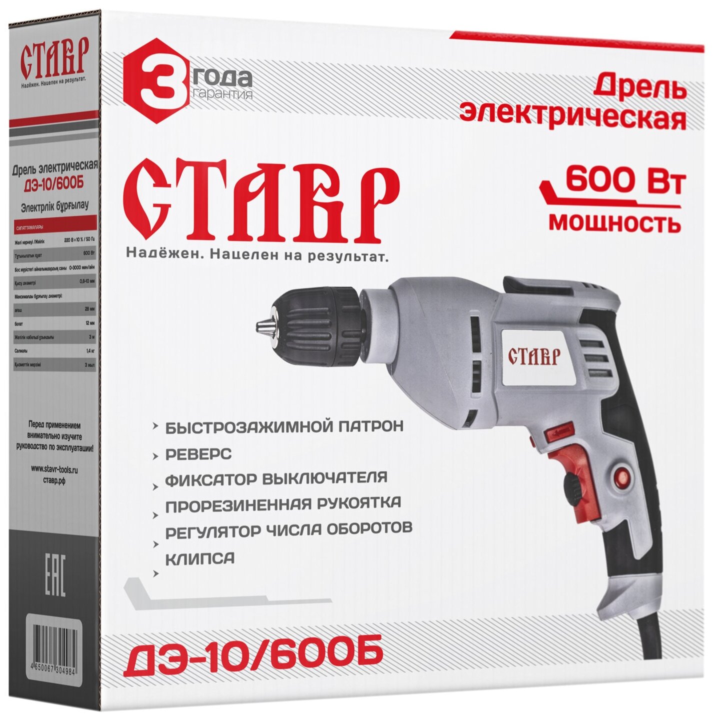 Ставр ДЭ-10/600Б (10шт) Дрель электрическая 600 Вт, 0-3000 об/мин, патрон 0,8- 10 мм быстрозажимной, реверс, регулировка оборотов, длина сетевого кабеля 3м