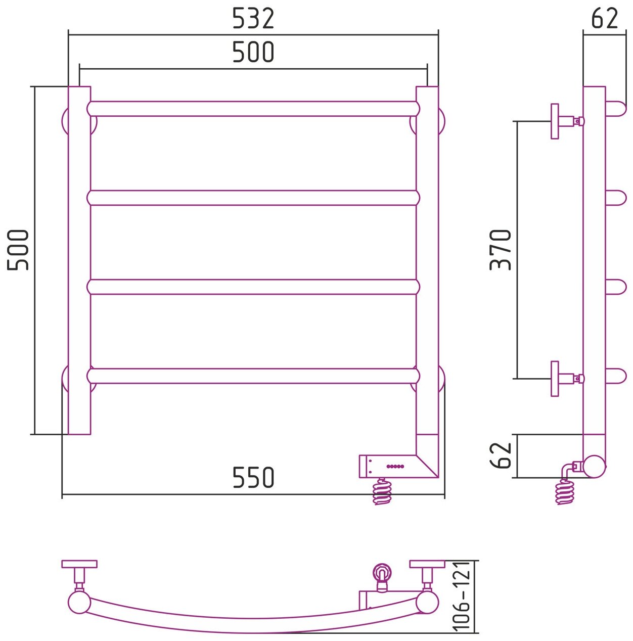 Полотенцесушитель электрический Сунержа, РЭБ “галант 2.0“ 500х500 / МЭМ правый (Без покрытия)
