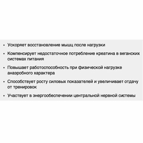 | Отзыв: | Попытался перейти на здоровое питание, отказаться от животной пищи, но столкнулся с проблемой нехватки креатина, как бы то не казалось глупым, последствия весьма неприятны, не скажу, что смертельны.