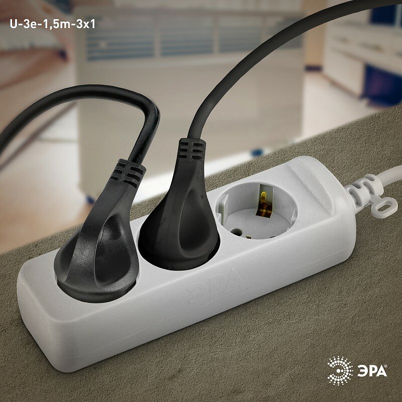 ЭРА Б0028369 Удлинитель U-3e-1,5m-3x1 с заземлением 3 гнезда 1,5 м {полипропилен, 3х1 мм2}