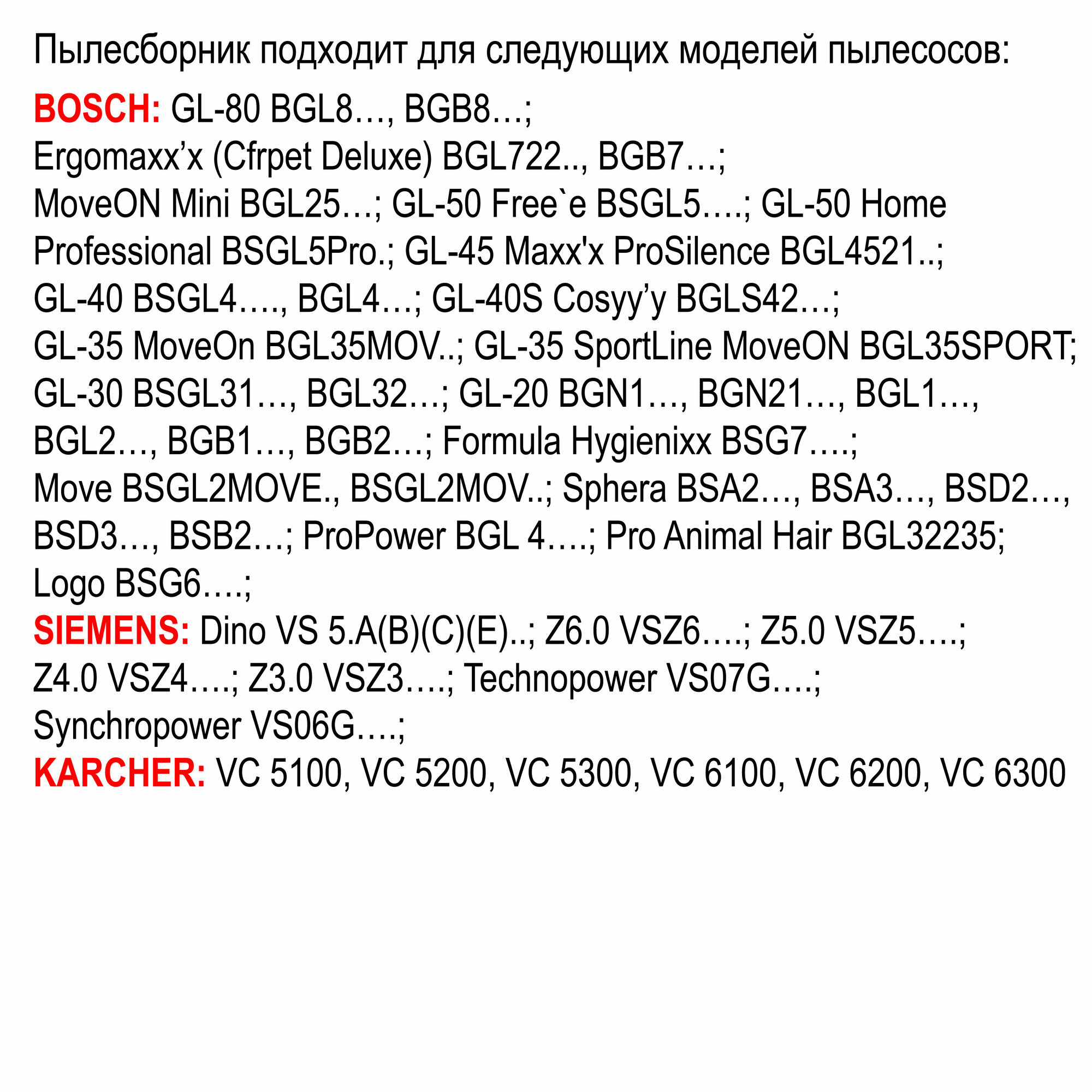 | Совместимые модели | bosch: gl-50 free`e bsgl5…., home professional bsgl5pro.; gl-45 maxx'x prosilencebgl4521..; gl-40 bsgl4…., bgl4....; gl-30 bsgl3…., bgl32..., pro animal hairbgl32235; gl-20 bgn21...; formula hygienixx bsg7….; logo bsg6….; move bsgl2move., bsgl2mov..; gl-35 moveon bgl35mov.., bgl35sport; sphera bsa2…, bsa3…, bsd2…, bsd3…; bsg 2...; bsg 4...; bsf 1...; bsd 1...; bsc 1...;bbs 8...; bbs 7...; bbs 6...; bbs 5...; bbs 2...; bbs 1...; siemens: z3.0 vsz3….; z4.0 vsz 4..; z5.0 vsz5….;z6.0 vsz 6..; technopower vs 07g....; synchropower vs 06g....; dino vs 5.a(b)(c)(e)..; vs 04g....; vs 9.a..;vs 81a..; vs 7.a(b)(c)(d)..; vs 7....; vs 69...; vs 6.a..; vs 5....; vs 42a(b)..-44a(b)..; vs 33a(b)..; vs 32a(b)..; vs10...; karcher: vc 5100, vc 5200, vc 5300, vc 6100, vc 6200, vc 6300 |