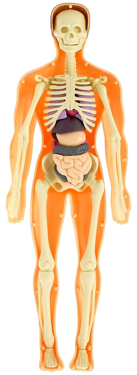 | Минусы: | Прозрачная только половина тела, то есть, чтобы посмотреть на органы, надо снять непрозрачную, а она защелкивается крепко и все разлетается, даже если снимать очень осторожно. Есть не все органы, например мочевой пузырь отсутствует. |