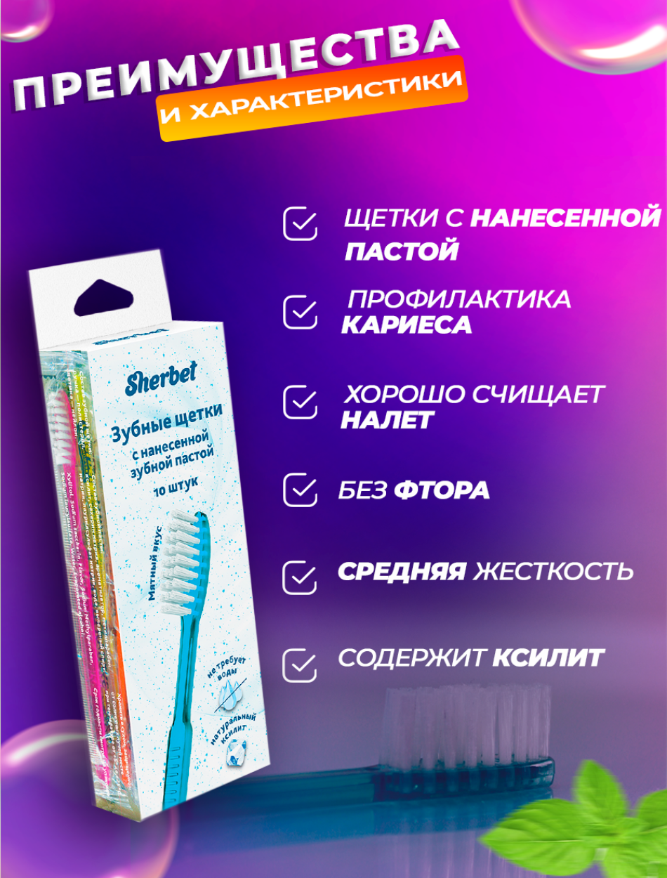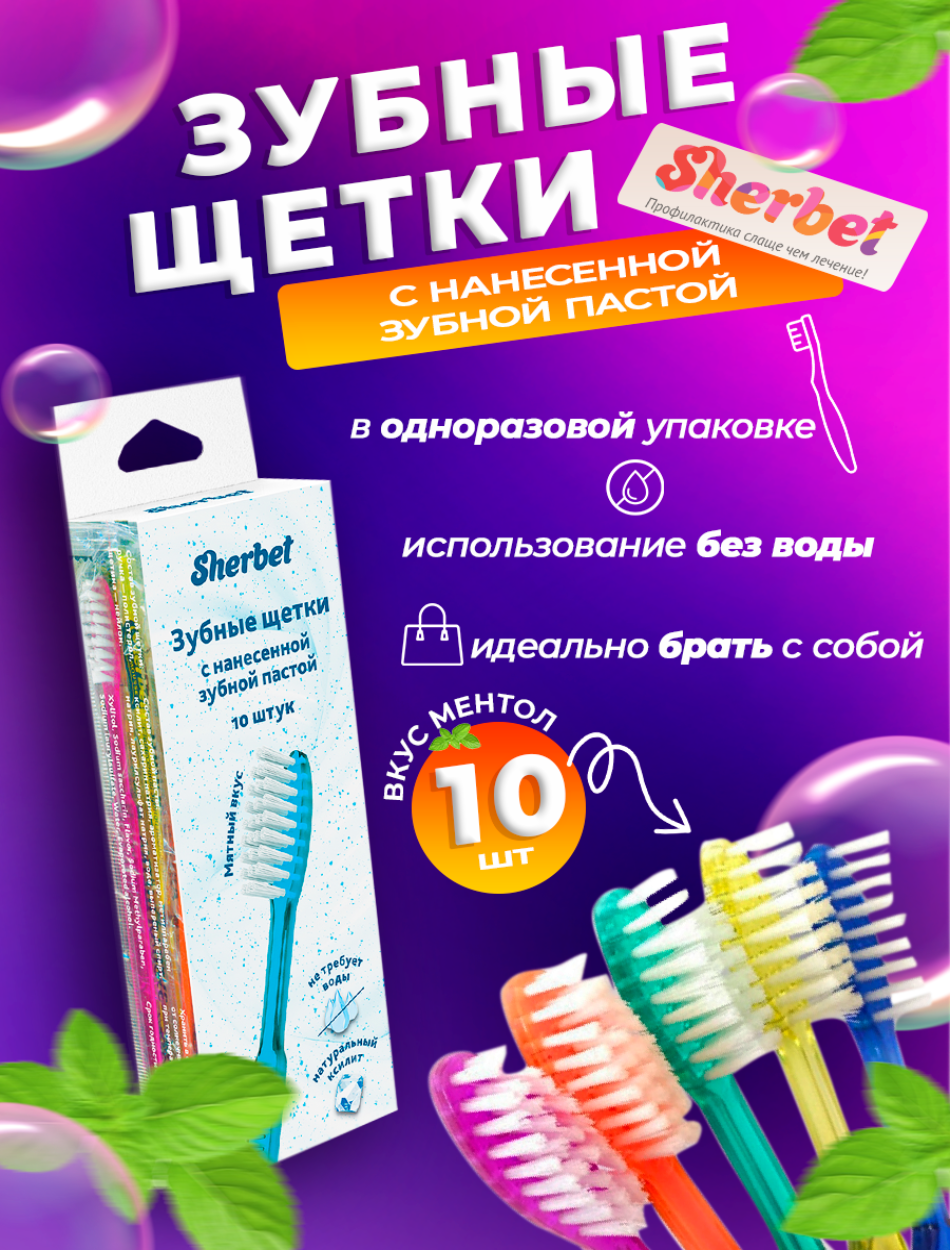 Зубная щетка Sherbet одноразовая с нанесенной зубной пастой Мятный мусс, синий / оранжевый / зеленый / фиолетовый / желтый, 10 шт.