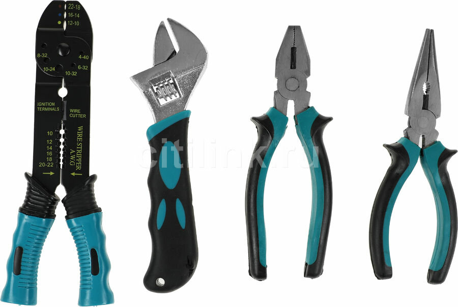 | Шарнирно-губцевый инструмент подробно | длинногубцы 160 мм - 1 шт.; клещи для зачистки и обжима проводов - 1 шт.; ключ разводной 180 мм - 1 шт.; плоскогубцы 160 мм - 1 шт. |