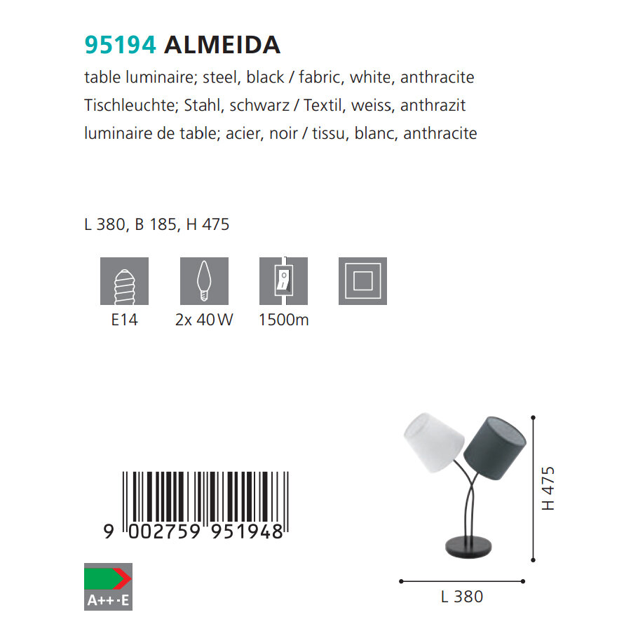 Купить Настольная лампа ALMEIDA 95194, 2х40W (E14), L380, H475, сталь, черный/текстиль, белый, антрацит
