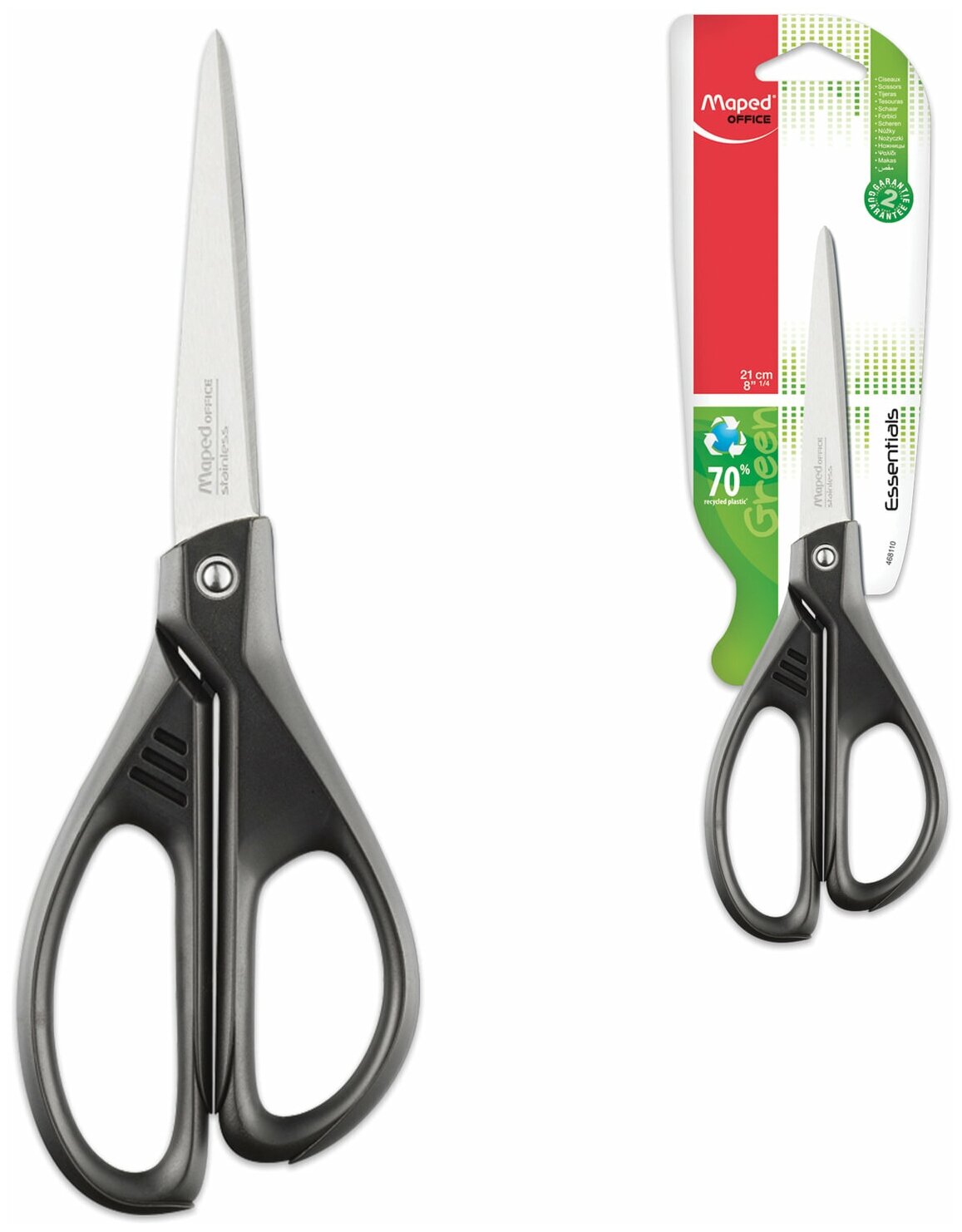 Комплект 2 шт, Ножницы MAPED"Essentials Green", 210 мм, черные, эргономичные ручки, картонная упаковка с европодвесом, 468110