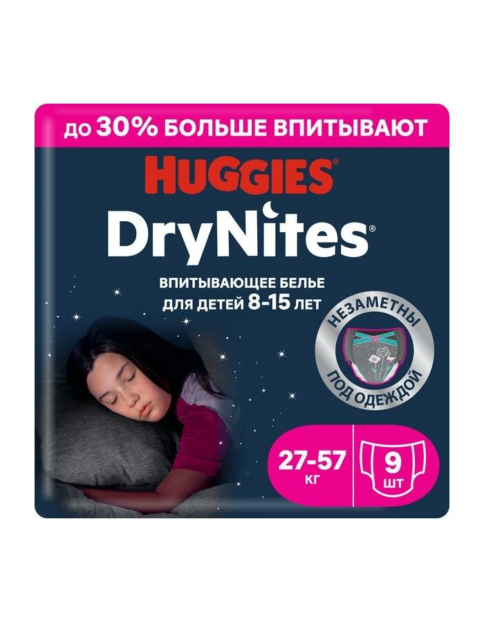 Подгузники-трусики детские для девочек HUGGIES DryNites 8–15 лет, 30–57кг, 9шт