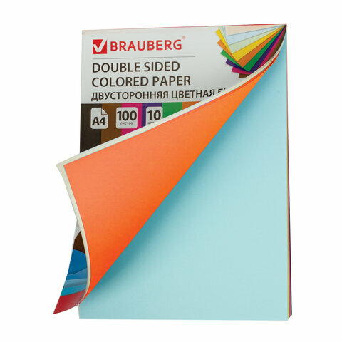 Цветная бумага Brauberg А4, тонированная в массе, 100 листов 10 цветов, склейка, 80 г/м2, 210х297 мм