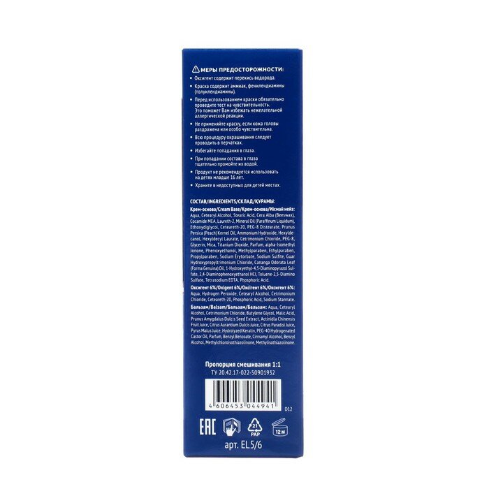 | Дополнительная информация | тест на чувствительности: приготовьте смесь из небольшого количества крем-основы и такого же объёма оксигента, перемешав их в любой неметаллической посуде. Не следует готовить весь объем краски. Нанесите приготовленную смесь на небольшой участок кожи на внутренней стороне локтевого сгиба или за ухом и оставьте на 10-15 минут. Затем смойте. Если в течение суток признаки аллергической реакции не появились, можете использовать краску |
