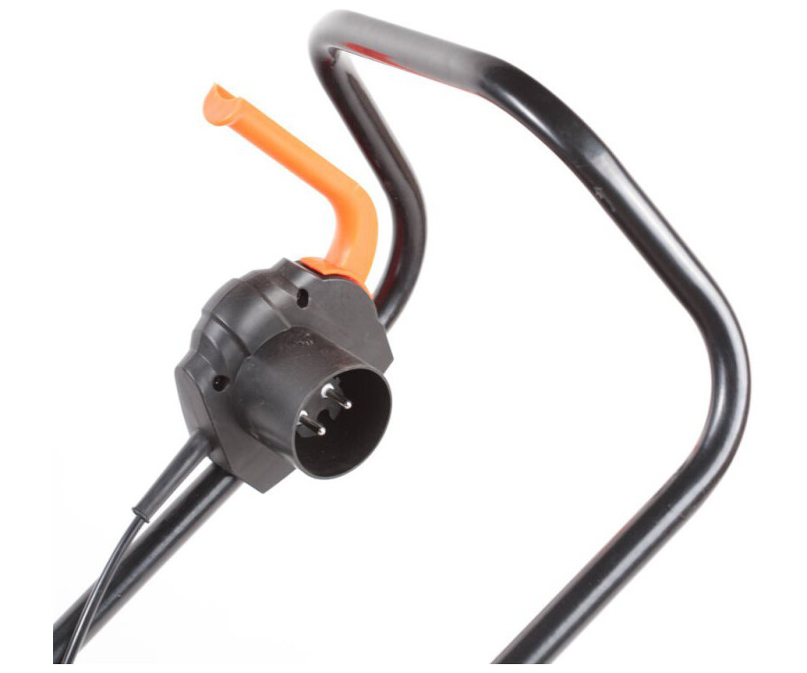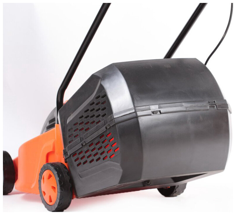 Ручка не регулируется, но мой рост 163 - высота ручки мне подходит Травосборник наполняется при покосе примерно 20 м2 газона Странный, на иой взгляд штекер для включения |