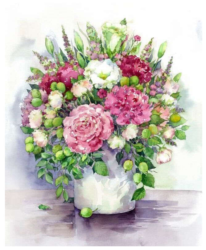 Алмазная живопись LG025 "Яркие пионы с зелеными плодами в белой вазе"