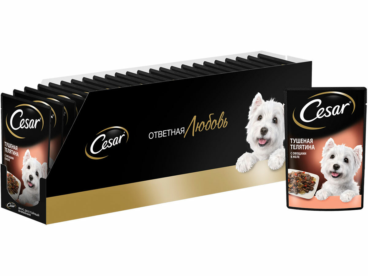 Cesar Паучи для взрослых собак, с тушеной телятиной и овощами в желе, 85г 10222849, 0,085 кг, 43492 (44 шт)