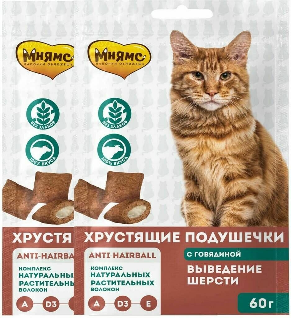 Мнямс хрустящие подушечки для кошек с говядиной Выведение шерсти 60 г NEW, 707933 (1 шт)