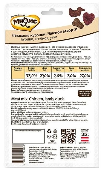 Мнямс лакомые кусочки для кошек мясное ассорти, курица, ягненок, утка 35 г