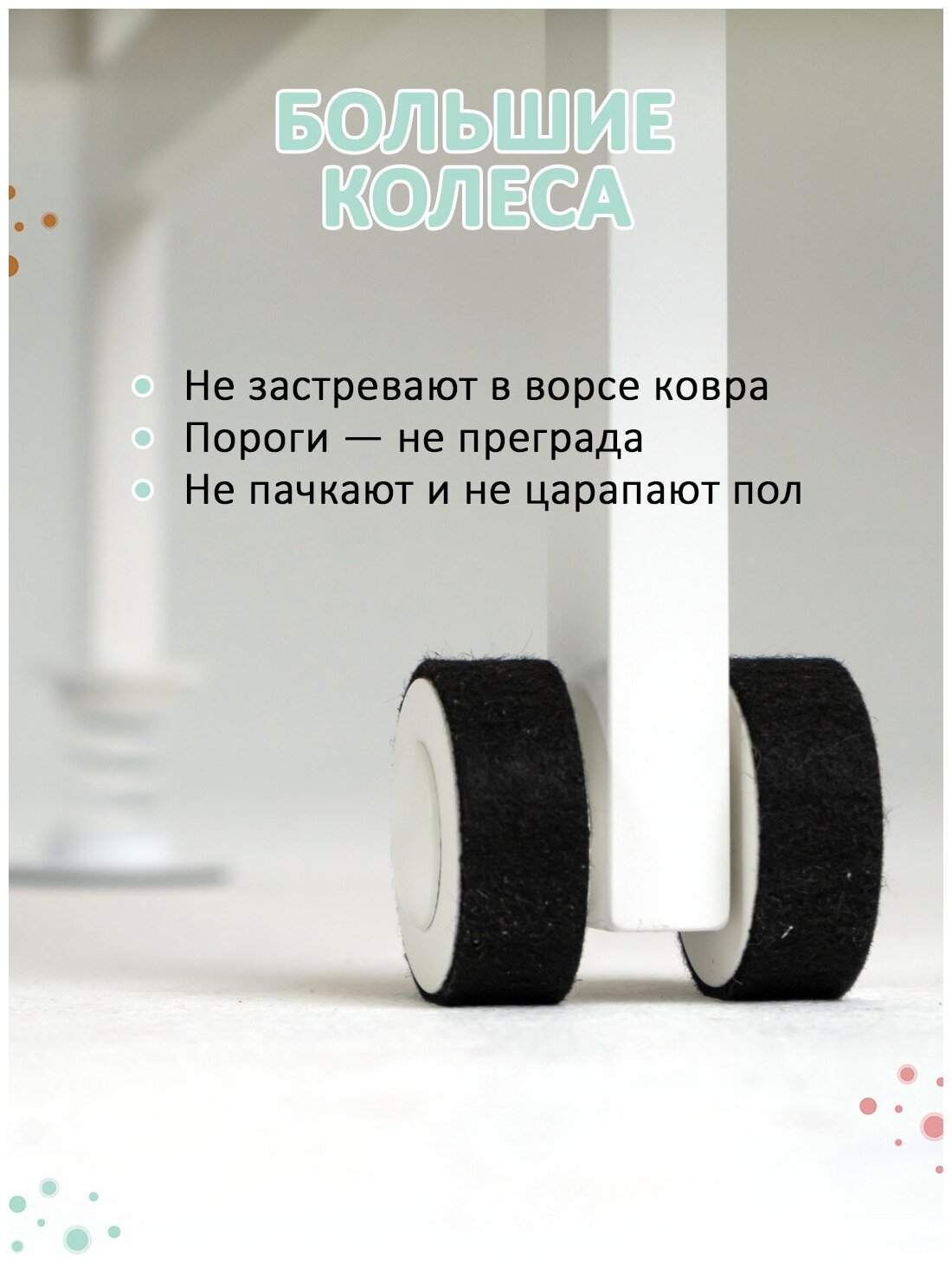 | Особенности | уникальная маятниковая система на пружинах (бесшумная и легко заменяется на обычные ножки при необходимости) / фетровые накладки на ножках / колесах и маятниках для защиты пола от царапин / большие колеса для преодоления порогов и ковров с высоким ворсом / тонкая настройка под высоту родительской кровати (8 положений с шагом 2,5 см) |