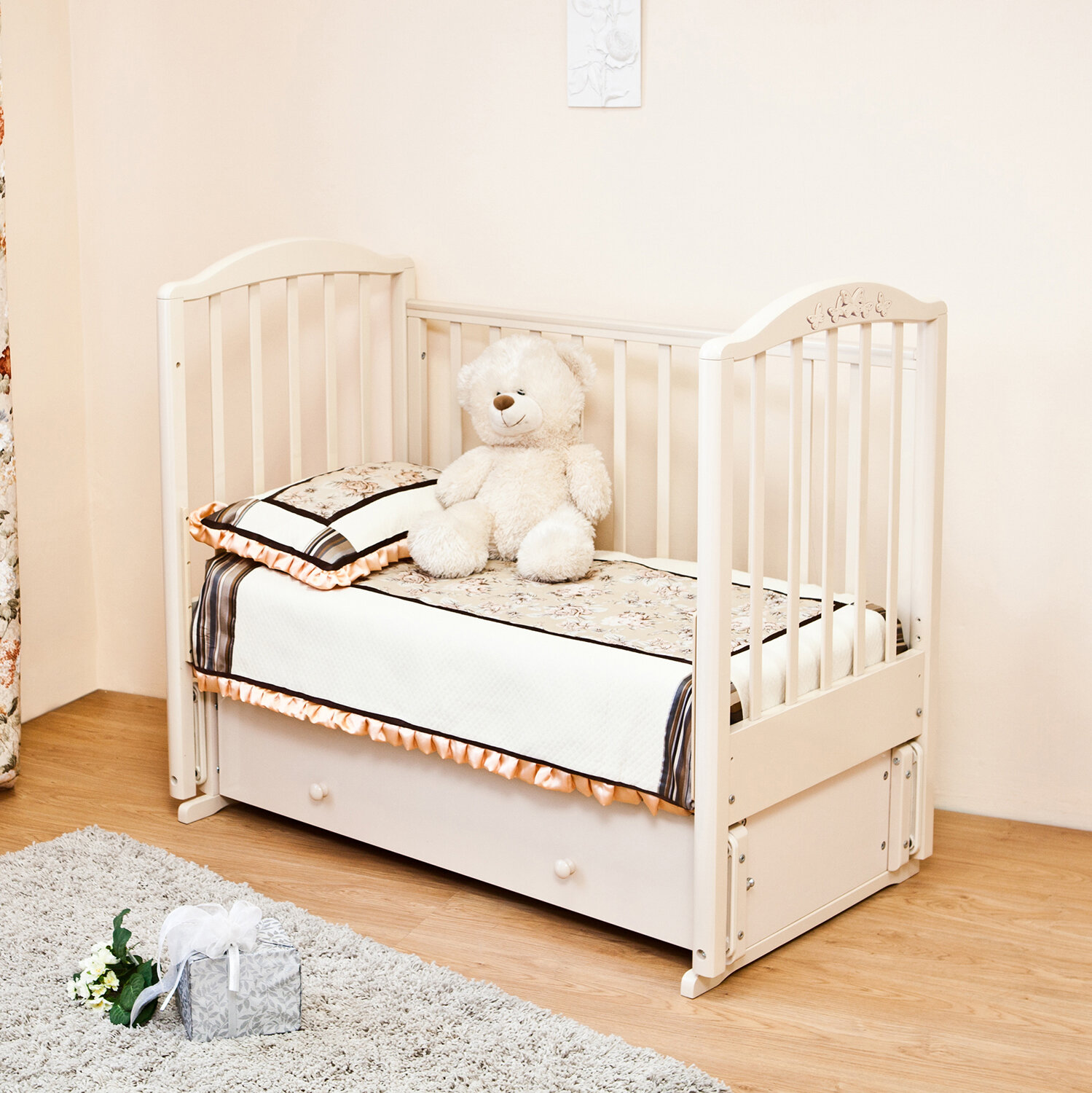 | Плюсы: | отличная качественная кроватка с продольным маятником, ничего не скрипит, качает плавно. бесшумно, в цвете шоколад смотрится очень богато. сладких снов малышам !!! |