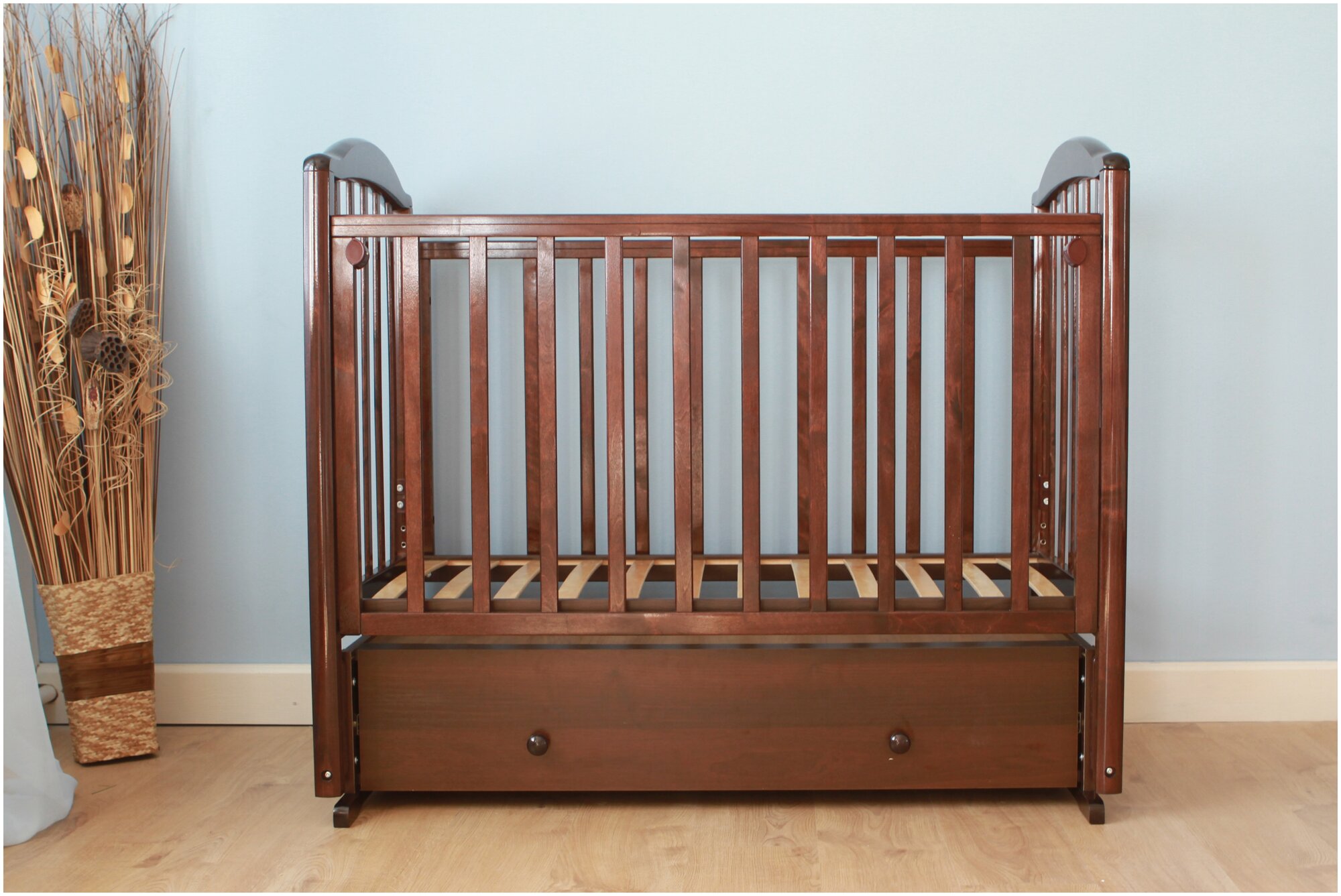 | Плюсы: | отличная качественная кроватка с продольным маятником, ничего не скрипит, качает плавно. бесшумно, в цвете шоколад смотрится очень богато. сладких снов малышам !!! |