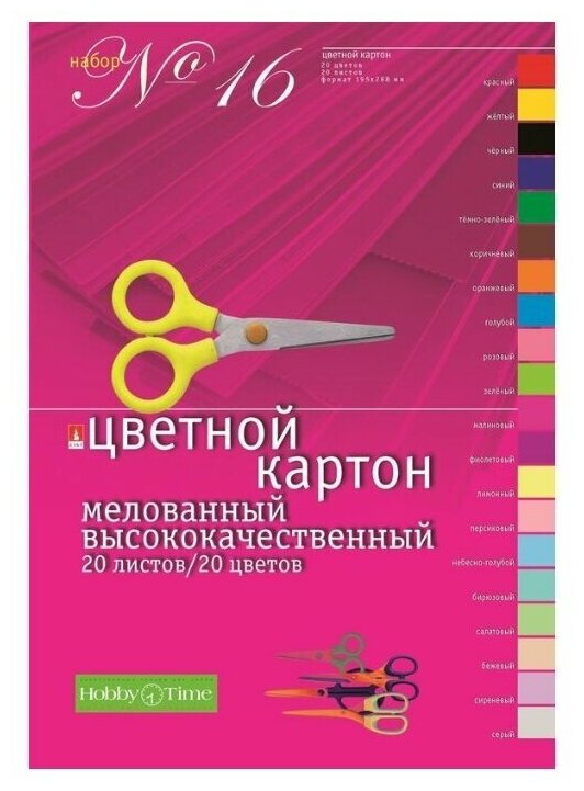 Картон цветной Альт (А4, 20 листов, 20 цветов, мелованный) 204894