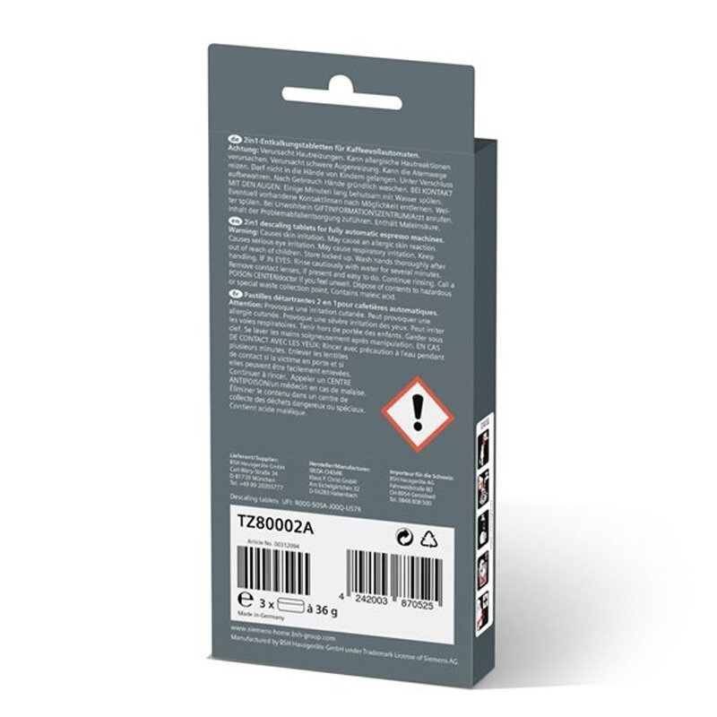 Таблетки TZ80002A для удаления накипи кофемашин Bosch, Siemens (3шт по 1,6грамм) 00312094