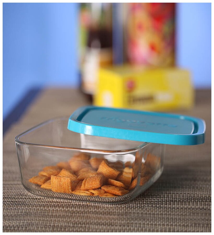 Купить Стеклянный контейнер Frigoverre квадратный 10*10 см, 340 мл, с синей крышко Bormioli Rocco B335190-1