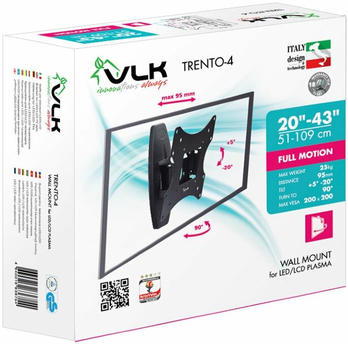 Кронштейны для техники VLK Кронштейн настенный VLK TRENTO-4 20-43" (наклон +5°/-20°, поворот 90°, до 25 кг, черный)