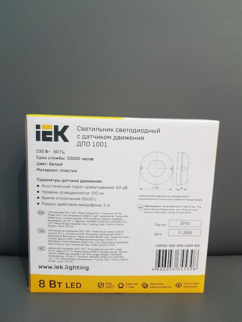 Светильник светодиодный ДПО 1001 8Вт 4000К IP54 с акуст. датчиком IEK LDPO3-1001-008-4000-K01 (2шт.в упак.)