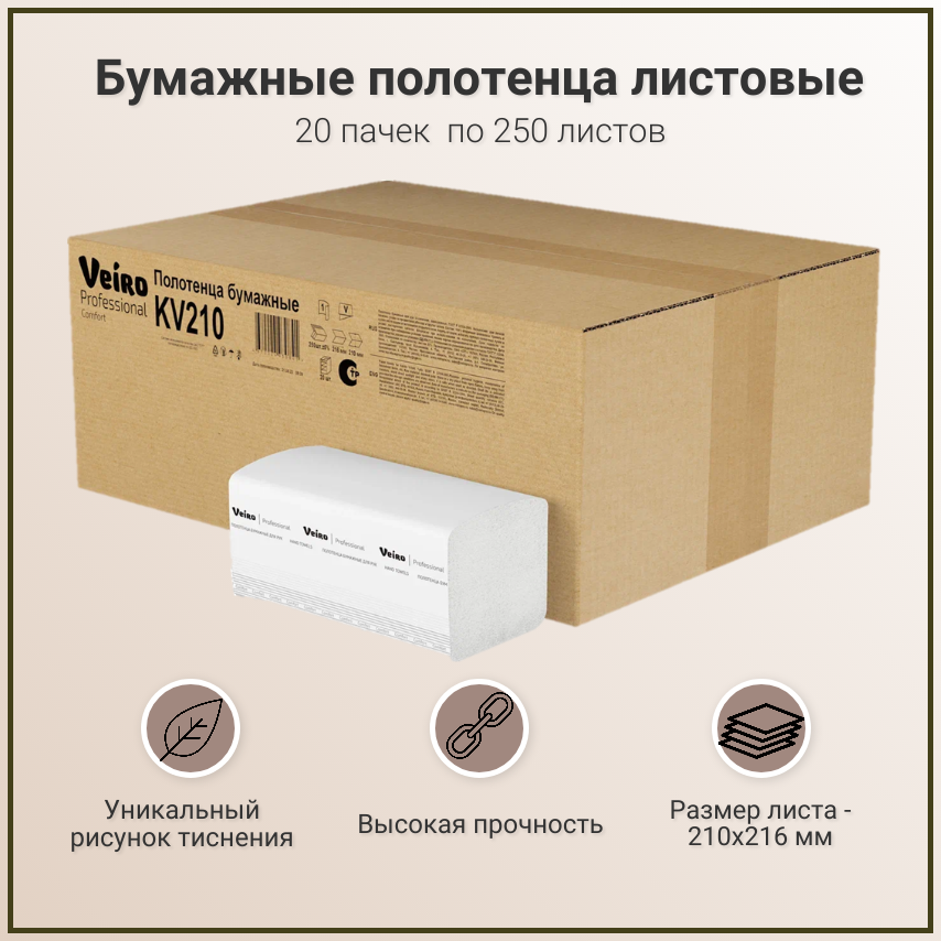 Полотенца бумажные Veiro Professional Comfort KV210 однослойные, листовые, V-сложение, 1 коробка - 20 пачек по 250 листов