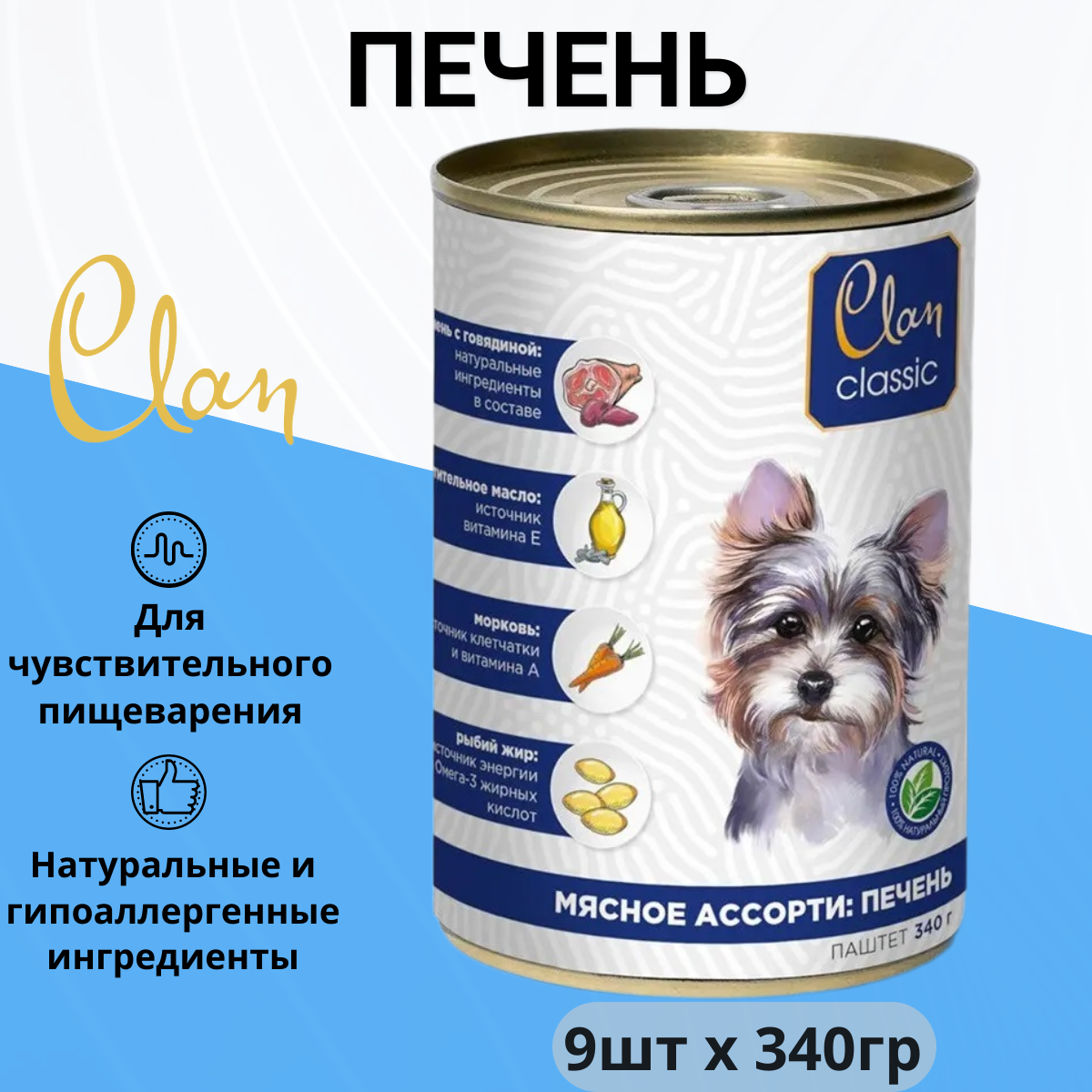 Корм полнорационный консервированный Clan CLASSIC для собак, Мясное ассорти с печенью, 340г, 6 шт.